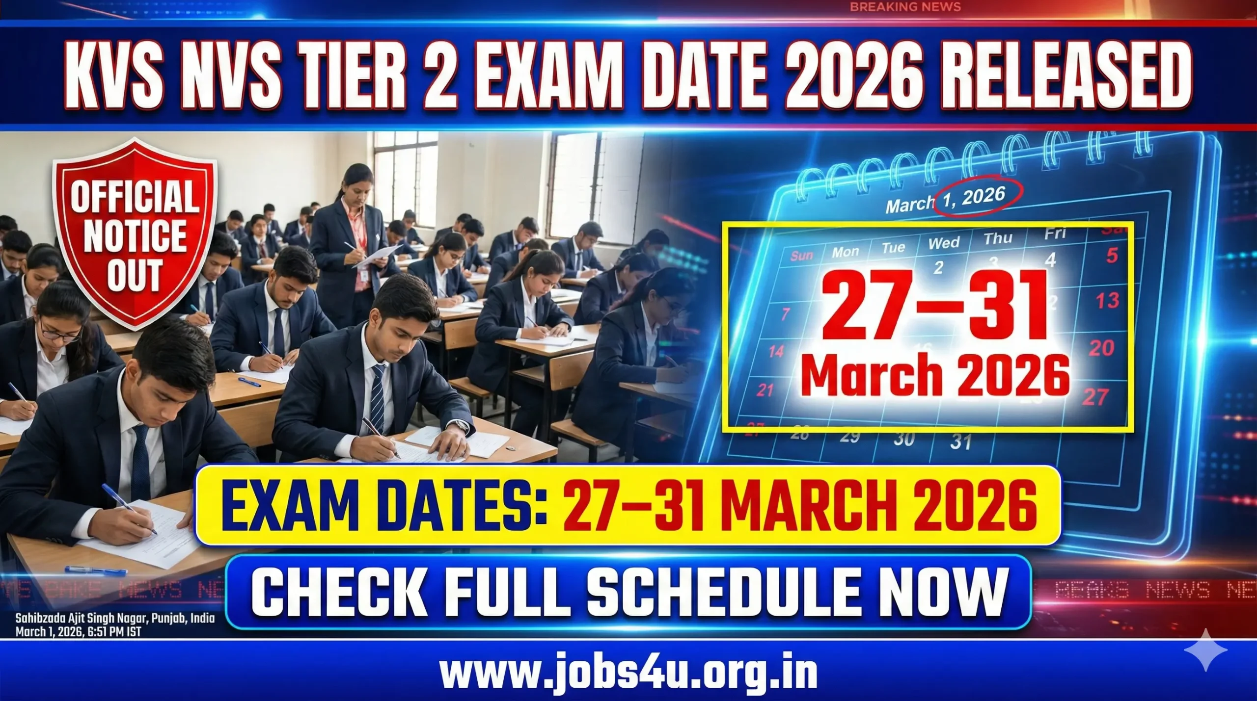 KVS NVS Tier 2 Exam Date 2026: Central Board of Secondary Education (CBSE) on behalf of Kendriya Vidyalaya Sangathan (KVS) and Navodaya Vidyalaya Samiti (NVS) has officially released the Tier 2 exam dates for joint recruitment to various teaching and non-teaching posts. Qualified candidates of Tier 1 can check the complete post-wise exam schedule below. Tier 2 exams are scheduled from March 27, 2026 to March 31, 2026. All eligible candidates are advised to prepare accordingly and stay updated through the official portal for admit card and other details.