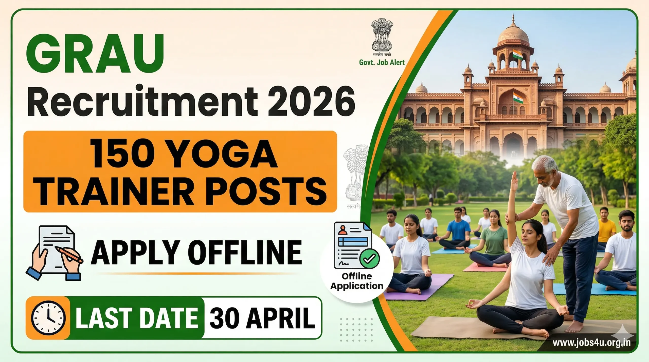 Guru Ravidas Ayurved University Punjab (GRAU) Recruitment 2026 notification released for 150 posts of Yoga Instructor. Candidates with Diploma can apply offline. The offline application process for GRAU Recruitment 2026 will be open till 30-04-2026. Candidates will apply offline through GRAU website, graupunjab.org.